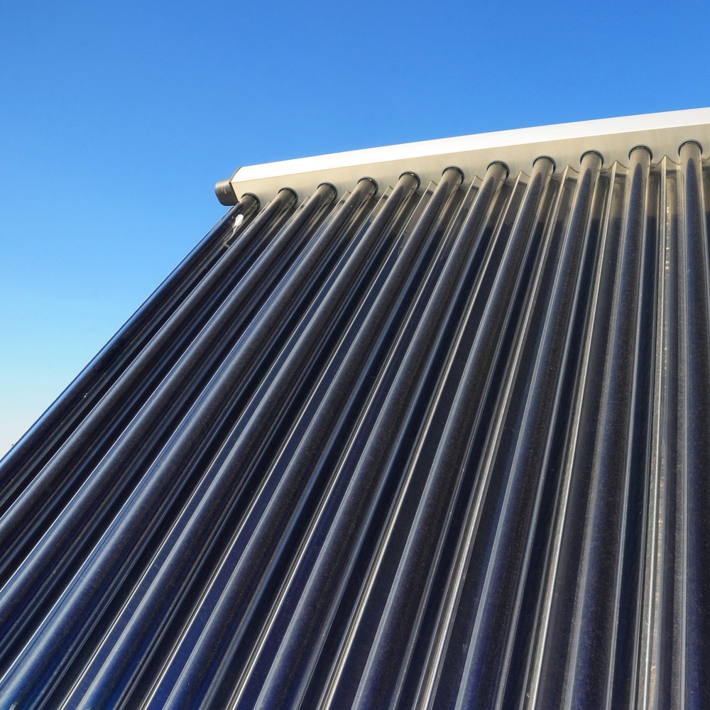 Die Kollektoren auf dem Dach (Flachkollektoren, Röhrenkollektoren oder Vakuumröhrenkollektoren) nehmen die Strahlung der Sonne auf. Dies ist vergleichbar mit einem geschlossenen Regenfass. Die Energie überträgt sich auf das im Inneren befindliche Wasser.